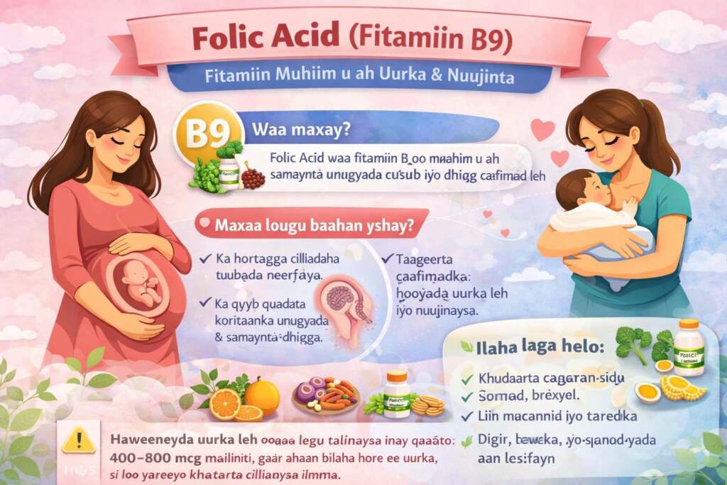 • Folic acid waa muhiim, gaar ahaan dhawrka toddobaad ee ugu horreeya uurka, inta badan ka hor inta aanu qofku ogaan inay uur leeyihiin.