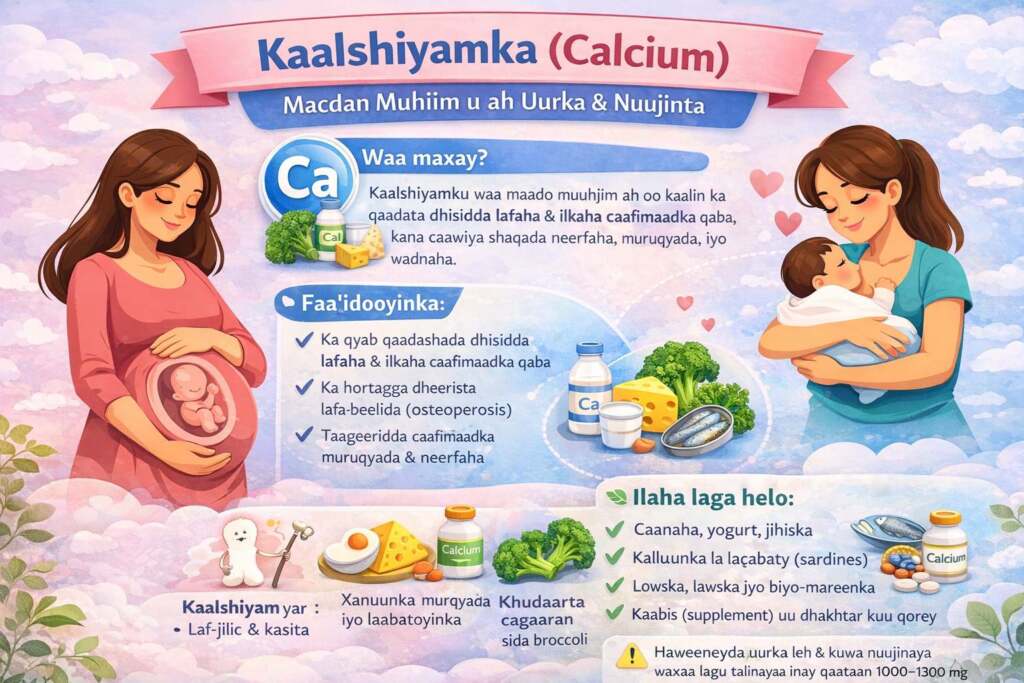 Kaalshiyamtu waa nafaqo muhiim ah oo lagama maarmaan u ah haweenka uurka leh iyo kuwa nuujinaya, maadaama uu taageero horumarka lafaha ilmaha isla markaana ilaaliyo caafimaadka lafaha hooyada. Ilaha ugu wanaagsan ee kalsiyumka waxaa ka mid ah caanaha iyo waxyabah laga sameeyo (caano, caano fadhi, farmaajo), caleenta cagaarkan (kale, broccoli, bok choy) iyo kalluunka.